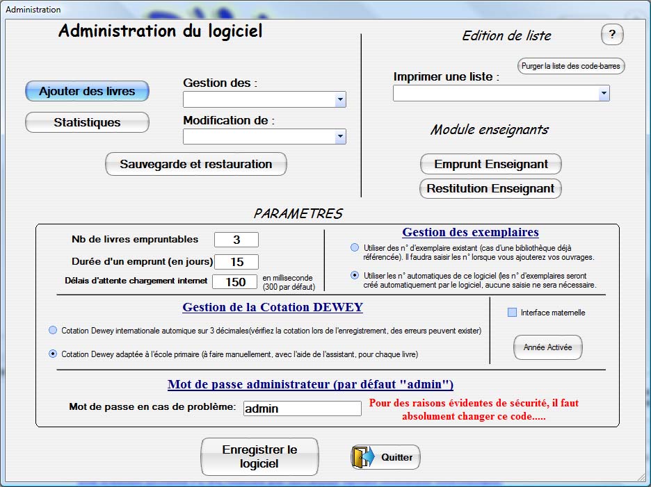 - Correction de plusieurs petits bugs: acquisition des couvertures des livres déjà enregistrés / n° d'exemplaire du prochain enregistrement / affichage du dernier emprunteur (me contacter si le pb persiste) / Cotation Dewey des périodiques / modification de l'auteur sur les livres déjà enregistrés..... |