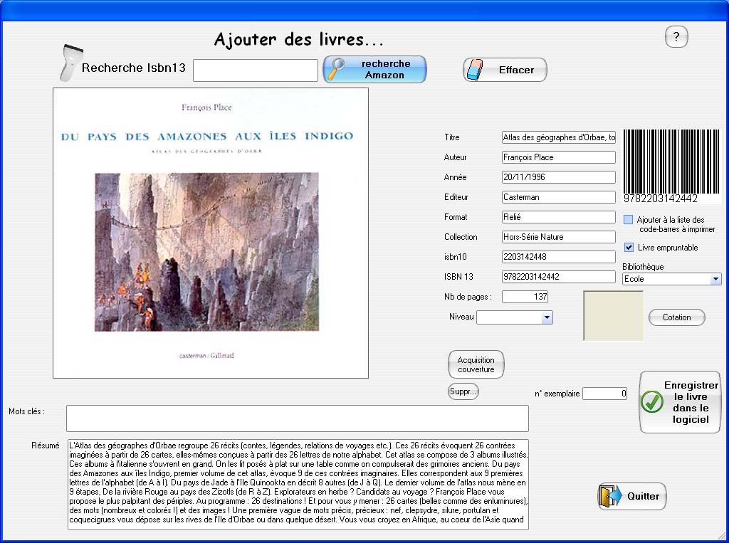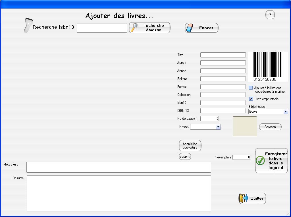 Le plus incroyable c'est que vous n'avez pratiquement aucune saisie à faire pour enregistrer vos livres dans votre logiciel. En effet Biblio.Net utilise une douchette (lecteur de code-barres) qui permet de scanner les livres. Une fois le code-barres déchiffré, le logiciel se connecte sur internet et importe toutes les informations concernant cet ouvrage. Si par hasard votre livre ne possède pas de code-Barres BiblioNet est capable de le générer grace à son ISBN. Vous pourrez donc l'imprimer afin de le coller directement sur le livre.