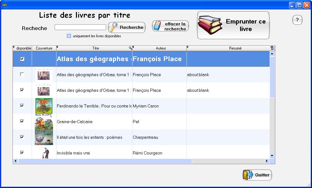 Les couvertures sont maintenant stockées à l'extérieur des fichiers de données. Cela permet d'augmenter la rapidité d'exécution du logiciel sur des postes anciens Ajout d'un accès à la fonction "rendre par lot" sur la page d'accueil. Utilisation en simultanné des fenêtres "rendre par lot" et "emprunt" pour permettre un gain de temps pour passer d'une fonction à une autre. Correction d'un bug dans les listes d'impression Améioration de la fonction rendre par lot |