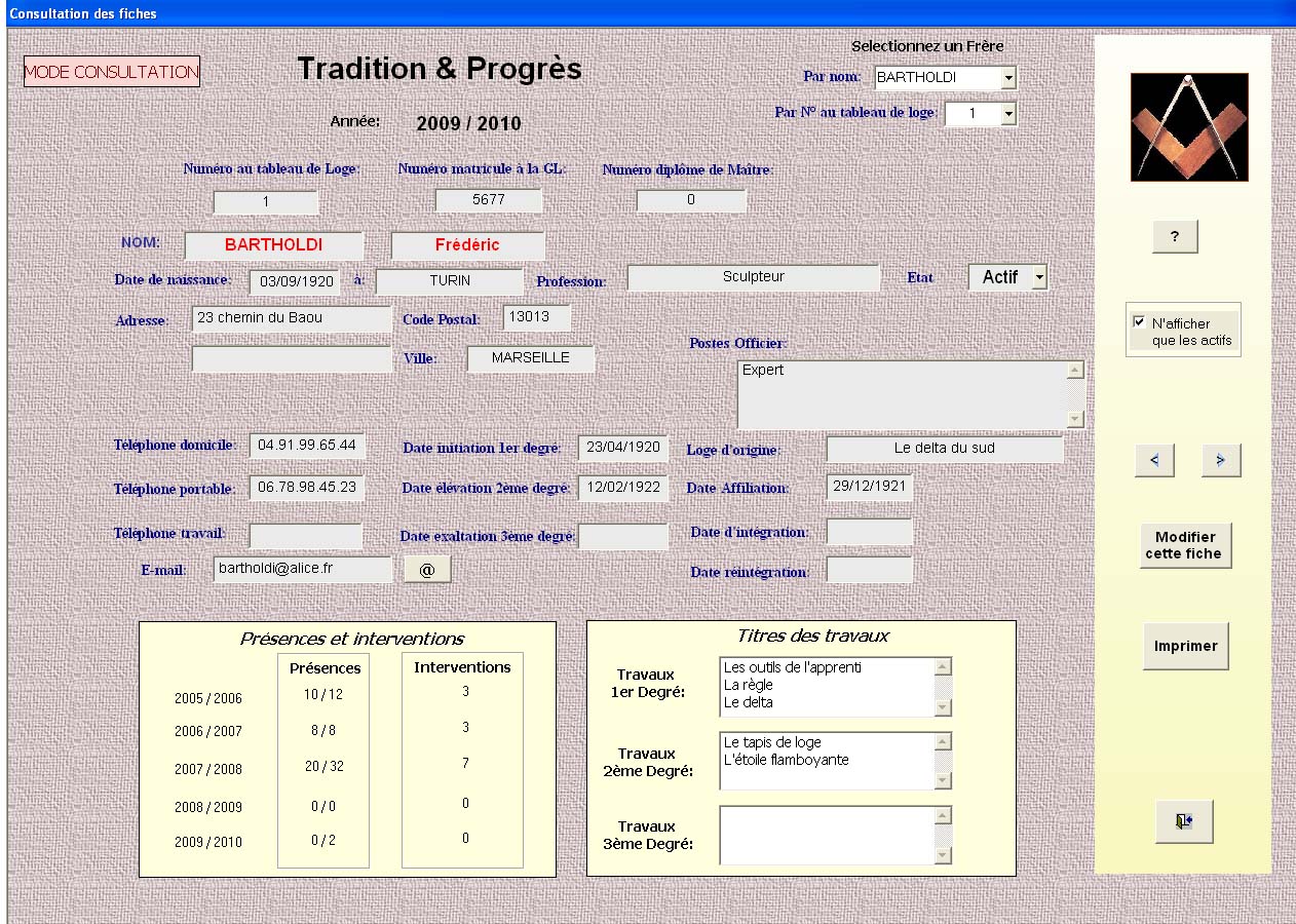 1) de consulter la fiche complète de chaque Frère (incluant aussi les présences, les interventions, les travaux réalisés et ce sur autant d’années qu’on le souhaite)